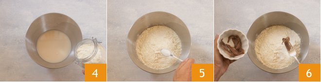 Transfer everything into the mixer bowl. Then add the flour 4, salt 5, and anchovy fillets, or anchovies, drained from the oil 6.