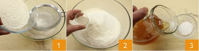To make the cider bread, sift the bread flour and whole wheat flour into a large bowl 1, add the dry yeast 2 and the malt. In a small bowl, dissolve the salt in a tablespoon of cider taken from the total amount 3,