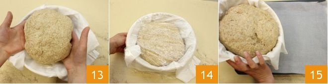 Gather the dough into a spherical shape and place it in the bannetons 13, cover with plastic wrap 14 and let rise again in the oven turned off with the light on for 1 hour, the dough should reach the edge of the basket. Flip the well-risen bread onto a baking sheet lined with parchment paper 15