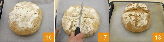 make a cross cut on the surface with a sharp knife (16-17). Bake the bread, making sure to place a bowl of water at the bottom of the oven; this will create a humid environment that will aid in baking the bread. Use a terracotta bowl or make sure it is oven-safe. Bake the bread in a static oven preheated to 482°F for 40 minutes. After this time, remove the bowl of water and lower the temperature to 392°F, continue for another 20 minutes, then turn the loaf upside down and continue baking for another 20 minutes. Turn off the oven and let the bread cool with the oven ajar, then remove it 18.