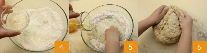 add the mixture to the dough 4, slowly add the cider in a thin stream, gradually gathering the ingredients with your hands 5. Transfer the dough to the work surface and continue kneading until it is smooth and soft 6.