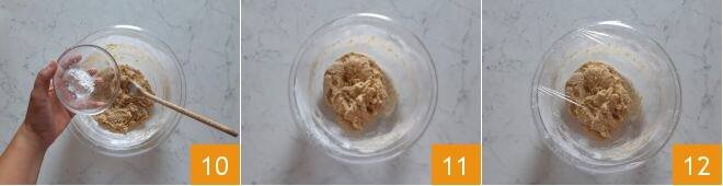 Add the baking powder last 10 and mix one last time 11. Cover with plastic wrap 12 and let it rest in the refrigerator for half an hour.