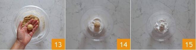 Then take the dough and form walnut-sized balls 13. Roll them first in granulated sugar 14 and then in powdered sugar 15.