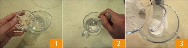 Cover with plastic wrap 16 and let rise for an hour in the oven with the light on (at a temperature between 77°F-82°F). Meanwhile, prepare a brine by mixing the water with the oil 17 18.