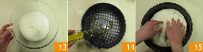 After this time, take the risen dough 13, carefully grease a pan that is 2 inches high and 10 inches in diameter with oil 14. Place the dough in the center and spread it over the entire surface of the pan with your hands 15.