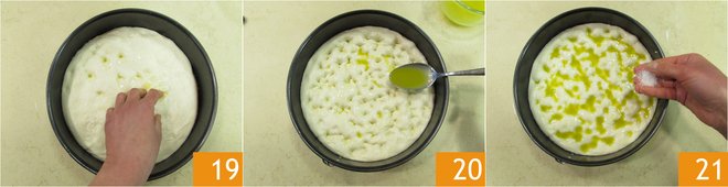 After the rising time, take the dough and press the surface with your fingertips to create the typical dimples of focaccia 19, then distribute the brine 20 and the salt flakes 21.