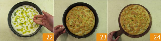 Add the rosemary needles 22 and bake in a preheated static oven at 392°F for 40 minutes. Once cooked, take your soft focaccia out of the oven 23, let it cool slightly, then remove it from the pan and serve while still warm 24!