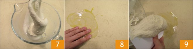 When the dough is smooth and homogeneous, stop the mixer. This will take about 10 minutes 7. Grease the work surface with a little oil 8, then turn the dough out 9.
