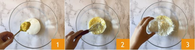To prepare the soft lemon muffins, work all the ingredients in a bowl. Then add sugar and grated lemon zest 1. Quickly mix with a whisk 2 and then add the flour 3,