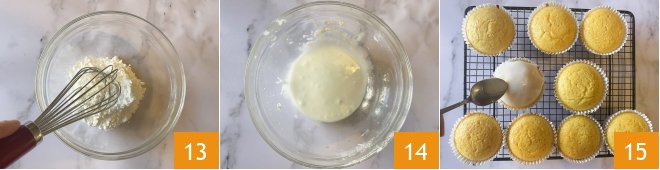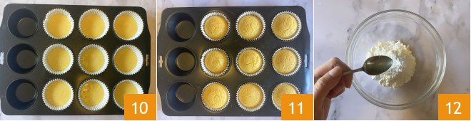 Your muffins are ready for baking 10: in a preheated static oven at 350°F, for about 20 minutes. Always do the toothpick test for safety; when they're ready, let them cool 11. Then prepare the lemon glaze: gradually add powdered sugar and lemon juice 12.