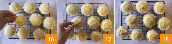and decorate each with half a lemon slice 16 and a fresh mint leaf 17. Here are your soft lemon muffins ready 18!