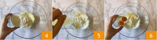 cornstarch 4, baking powder, milk, oil, and lemon juice 5, then the eggs 6.