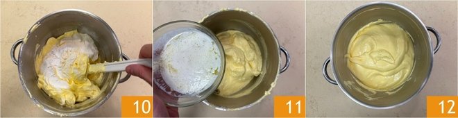 Mix as before, gently with the spatula 10. Pour in the cooled melted butter 11 and combine one last time to obtain a homogeneous batter 12.