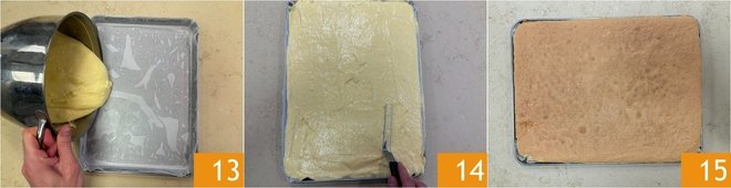 Pour the mixture into a greased and parchment-lined rectangular pan of 12x16 inches 13, then level it well with a spatula 14. Bake in a preheated static oven at 375°F for 15 minutes. Once baked, remove the sponge cake and let it cool 15.