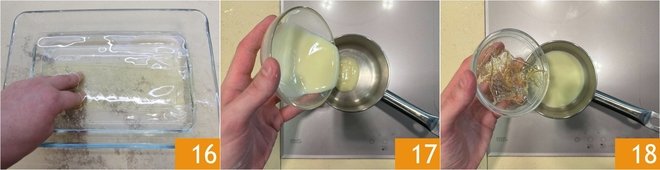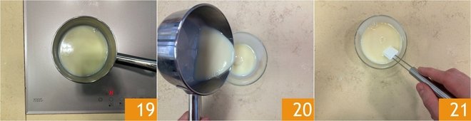 Meanwhile, soak the gelatin sheets in cold water to soften them 16. In a saucepan, heat half the dose of condensed milk 17 together with the drained and squeezed gelatin 18.