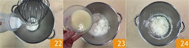 In the bowl of the stand mixer, pour the cold liquid cream from the fridge 22, then whip with the beaters until frothy. Incorporate the condensed milk 23 and mix to obtain a homogeneous cream 24.