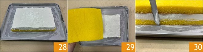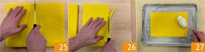 Now unmold the sponge cake onto a cutting board and cut it in half to obtain 2 equal-sized rectangles 25. Trim the edges with a knife 26, then spread the cream prepared with the condensed milk on one of the bases 27.