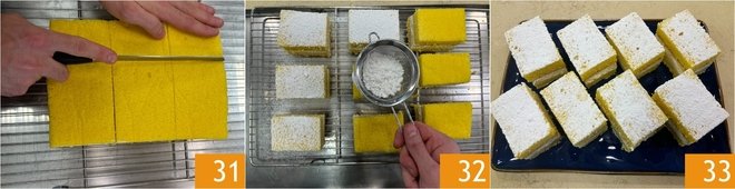 Now cut the dessert to obtain 9 rectangles 31. Garnish with powdered sugar 32 and serve your soft milk cakes immediately 33!