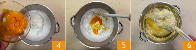 At this point, add the egg yolks 4 and gently mix with a spatula to avoid deflating the egg whites, using movements from top to bottom 5, until they are well incorporated 6.