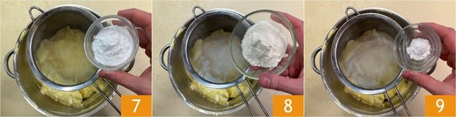Now add the sifted dry ingredients through a sieve: the cornstarch 7, flour 8, and baking powder 9.