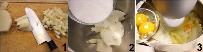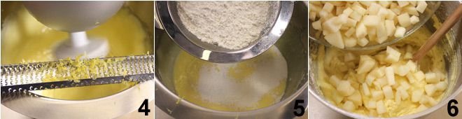 add the grated lemon zest 4. Sift the flour with the baking powder and add them to the mixture 4, stirring with a wooden spoon until you get a smooth batter. Incorporate the cubed pears 6