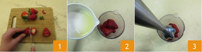 To prepare the soft strawberry cake, first wash the strawberries and remove the stem 1. Transfer them to a tall, narrow container, add the lemon juice 2, blend with an immersion blender 3 and set aside.