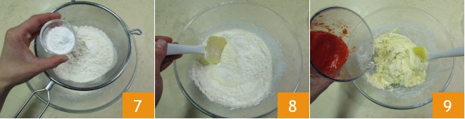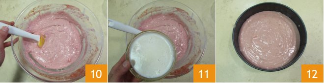 and the baking powder 7. Mix them into the batter, stirring gently with a spatula from bottom to top and also clockwise 8. Add half of the strawberry puree 9