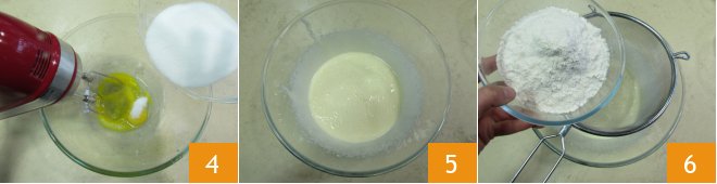 Melt the butter over low heat and let it cool. Pour the eggs into a large bowl and start beating them with an electric mixer, gradually adding the sugar 4. You should obtain a light and frothy mixture 5. At this point, sift in both the flour 6,