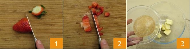 To make the soft strawberry cookies, first wash and dry the strawberries, then remove the hull 1 and cut them into small cubes 2. In a bowl, place the soft butter cut into pieces, and the sugar 3