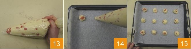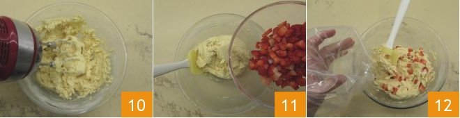 Mix to incorporate the dry ingredients 10 and then add the diced strawberries to the batter 11, distribute evenly using a spatula, then transfer the batter into a disposable piping bag without a nozzle 12.
