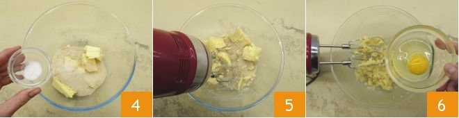 and the salt 4. Beat the mixture with electric whisks for a couple of minutes 5, then add the egg 6,