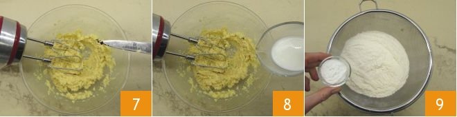 the seeds from the vanilla pod 7, and the milk 8, blend the mixture with the whisks and then add the flour and baking powder sifted through a sieve 9.