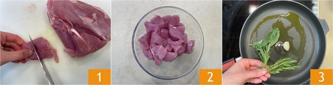 To prepare the soft turkey in the pan, first take care of the meat. Cut the turkey breast into chunks of about 3/4 inch 1 2. In a well-heated non-stick pan, pour the oil, add the clove of garlic, sage, and rosemary 3.