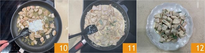 Stir 10, cover with a lid, and let it cook for about 10 minutes over medium heat. When it is tender and the sauce is creamy 11, the turkey will be ready, and you can serve it hot 12.