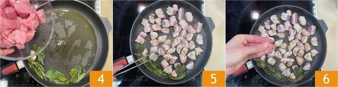 Let it brown over low heat. Add the turkey 4 and let it brown over medium heat on both sides 5, then add salt 6.