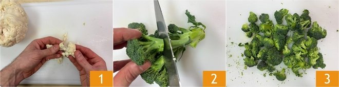 To prepare the sole en papillote with steamed vegetables, start with the vegetables. Separate the cauliflower florets and cut the larger ones in half 1. Do the same with the broccoli 2 3.