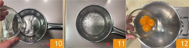 Focus on the Hollandaise sauce. Pour the vinegar into a small pan 10 and a tablespoon of water. Bring to heat and cook until the mixture is reduced by half; this will take a few minutes 11. Meanwhile, melt the clarified butter. At this point, place the yolks in a heatproof bowl in a bain-marie 12.