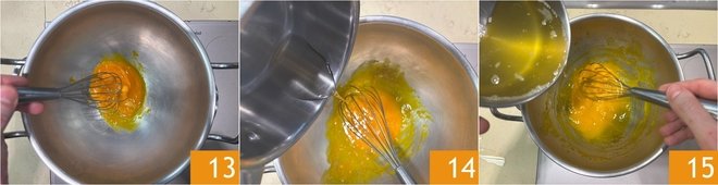 Begin to whisk them with a hand whisk 13, then add the reduced vinegar mixture 14. Continue whisking until the mixture thickens (it should reach about 149°F), then slowly add the melted clarified butter while continuing to whisk 15. Stir until you obtain a creamy sauce.