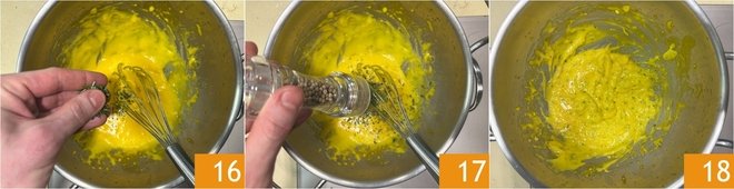 Off the heat, season with chopped tarragon 16, a pinch of salt, and pepper 17. Your Hollandaise sauce is ready 18.