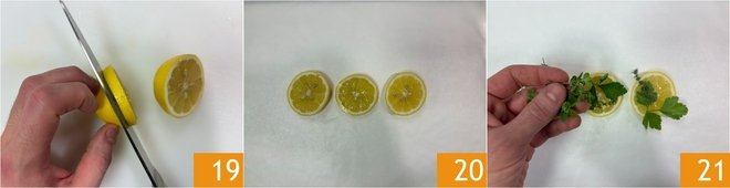 Now proceed to cook the fish. Cut the lemons into slices 19, then place 3 slices on a sheet of parchment paper 20 and arrange the aromatic herbs on top 21.