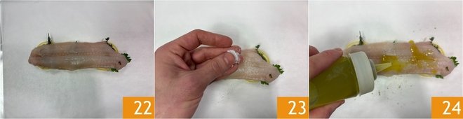 Lay a fish fillet on top 22 and season with salt 23, pepper, and oil 24.