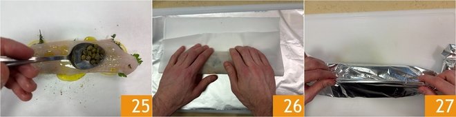 Add a handful of capers on top 25. Now wrap the sole fillet first in parchment paper 26 and then in foil 27 to seal it well and form a packet.