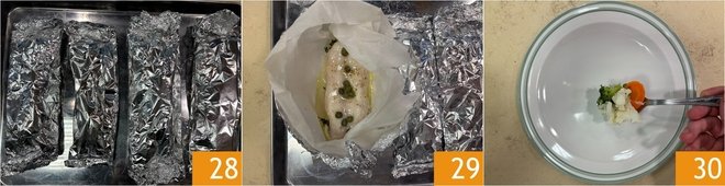 Proceed in the same way for all 4 fillets, placing them one by one on a baking sheet 28. Bake in a preheated static oven at 350°F for 15-20 minutes. The cooking time may vary depending on the size of the fillets. Remove the sole en papillote from the oven and carefully unwrap them 29, then plate. Place the vegetables on the bottom of the plate (you can reheat them for a few minutes in a bain-marie) 30.