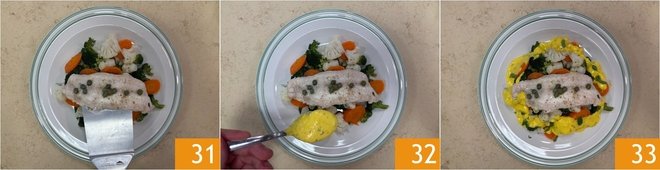 Lay the fish on top 31 and garnish with the tarragon Hollandaise sauce 32. Your sole en papillote with steamed vegetables is ready to be served 33!