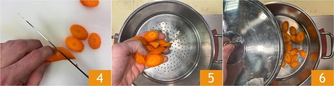 Move on to the carrots: peel them and cut them into diagonal slices 4. Now heat some water in a steamer and add a pinch of salt. Place the steaming basket above. Once it reaches a boil, place the carrots inside the basket 5. Cover with a lid 6 and cook for 5 minutes.
