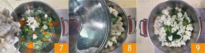 After this time, add broccoli and cauliflower 7, cover again with the lid 8, and cook for another 10 minutes. The vegetables should be tender yet still crunchy 9. Season with salt.