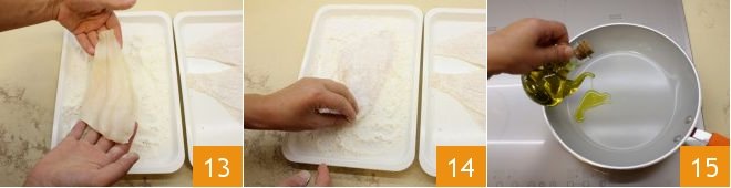 Pass the fillets in the flour 13, pressing well with your fingers so that the breading adheres well on both sides 14, then put a pot with oil on the heat 15;