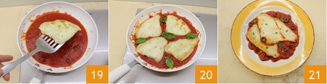 then place the still hot fillets in the tomato and olive sauce you prepared earlier 19. Cook for 2 minutes and finish by adding a few basil leaves 20: your Sorrento style sole fillet is ready to be served and enjoyed 21.