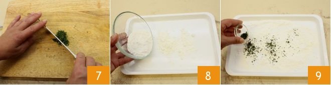 In the meantime, take care of the sole fillets. Chop the oregano 7, spread the flour on a tray 8, add the chopped oregano 9,