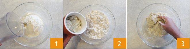 To prepare the sourdough bread with pumpkin seeds, combine the flour, water 1, and refreshed sourdough from 1 day ago 2 in a bowl. Work with your hands for about 5 minutes until you obtain a soft and homogeneous dough 3.